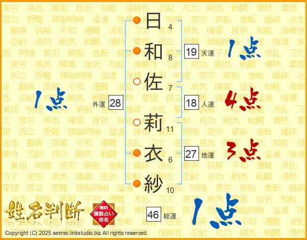 日(4画)和(8画)佐(7画) 莉(11画)衣(6画)紗(10画)