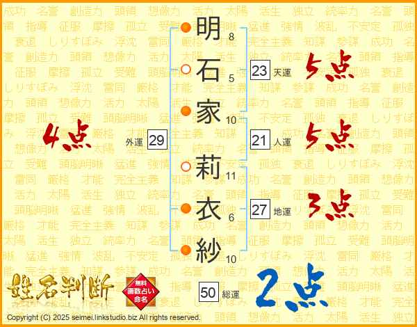 明(8画)石(5画)家(10画) 莉(11画)衣(6画)紗(10画)