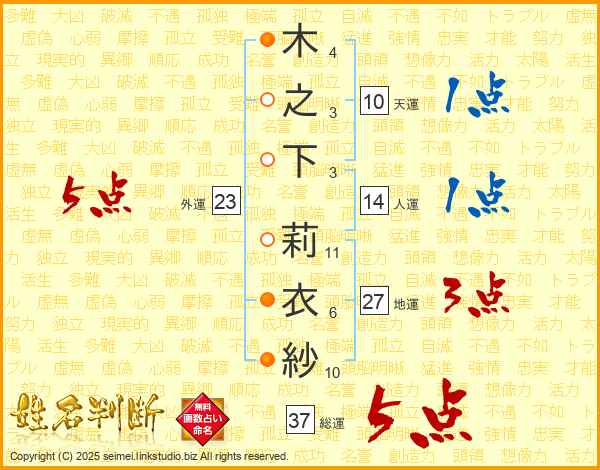 木(4画)之(3画)下(3画) 莉(11画)衣(6画)紗(10画)