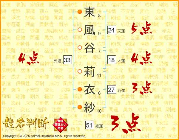 東(8画)風(9画)谷(7画) 莉(11画)衣(6画)紗(10画)