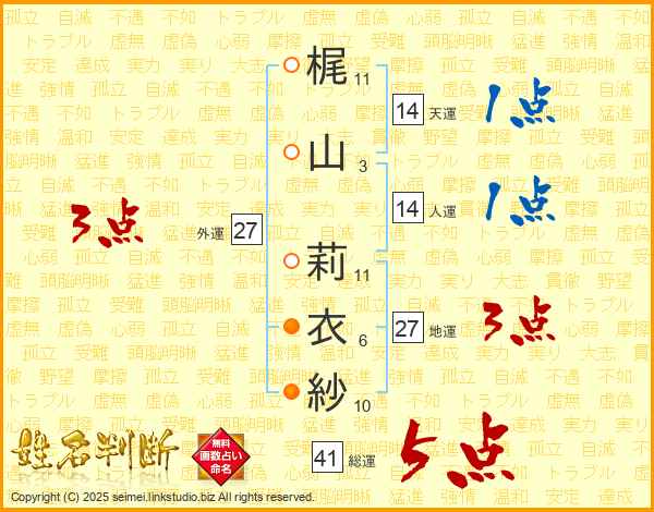梶(11画)山(3画) 莉(11画)衣(6画)紗(10画)