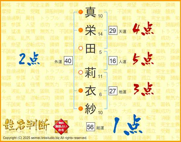真(10画)栄(14画)田(5画) 莉(11画)衣(6画)紗(10画)