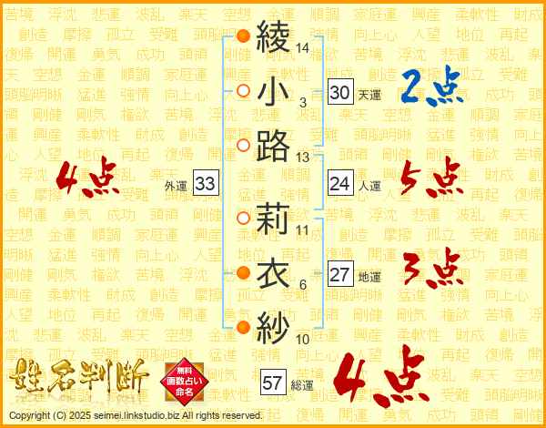 綾(14画)小(3画)路(13画) 莉(11画)衣(6画)紗(10画)