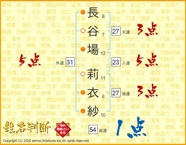 長(8画)谷(7画)場(12画) 莉(11画)衣(6画)紗(10画)