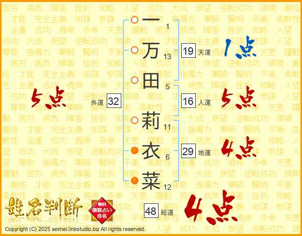 一(1画)万(13画)田(5画) 莉(11画)衣(6画)菜(12画)