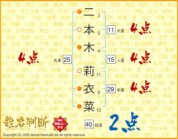二(2画)本(5画)木(4画) 莉(11画)衣(6画)菜(12画)