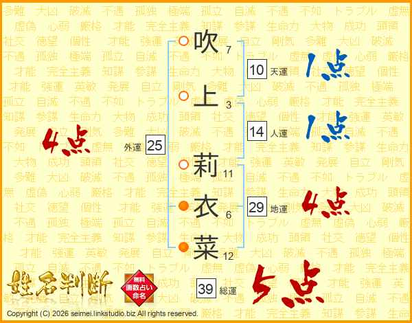 吹(7画)上(3画) 莉(11画)衣(6画)菜(12画)