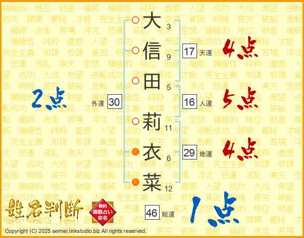大(3画)信(9画)田(5画) 莉(11画)衣(6画)菜(12画)
