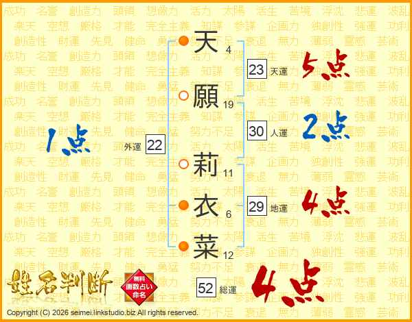 天(4画)願(19画) 莉(11画)衣(6画)菜(12画)