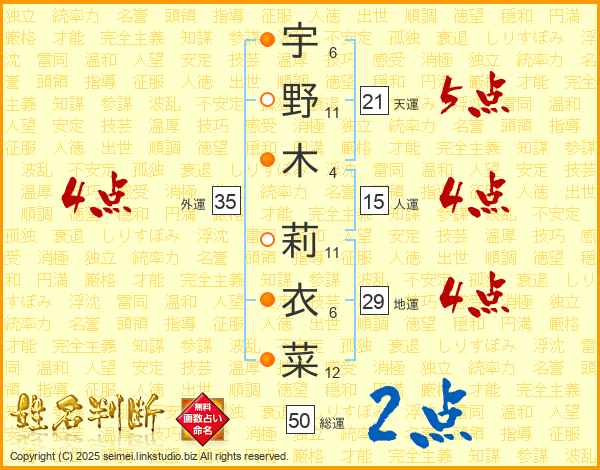 宇(6画)野(11画)木(4画) 莉(11画)衣(6画)菜(12画)