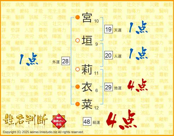 宮(10画)垣(9画) 莉(11画)衣(6画)菜(12画)
