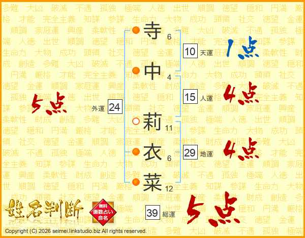 寺(6画)中(4画) 莉(11画)衣(6画)菜(12画)