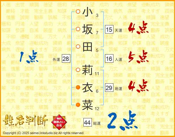 小(3画)坂(7画)田(5画) 莉(11画)衣(6画)菜(12画)
