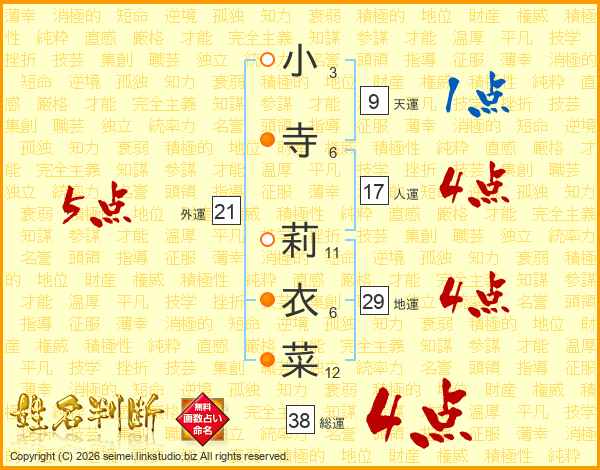 小(3画)寺(6画) 莉(11画)衣(6画)菜(12画)