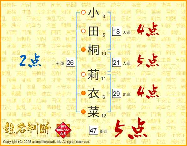 小(3画)田(5画)桐(10画) 莉(11画)衣(6画)菜(12画)