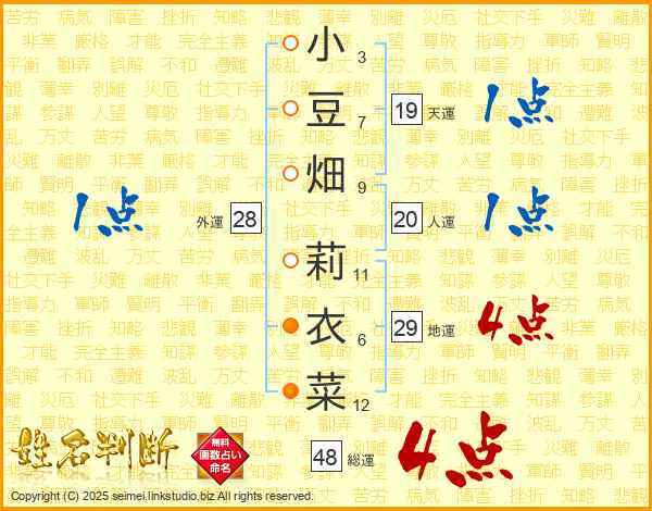 小(3画)豆(7画)畑(9画) 莉(11画)衣(6画)菜(12画)