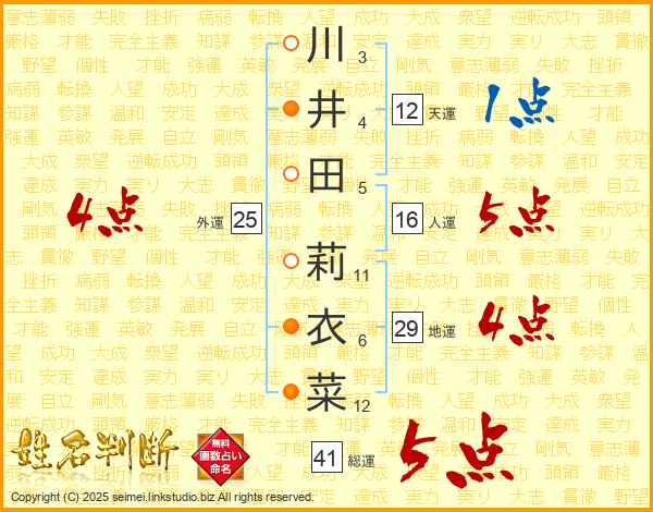 川(3画)井(4画)田(5画) 莉(11画)衣(6画)菜(12画)