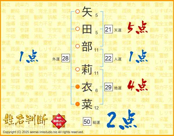 矢田部莉衣菜さんの地運は29画の4点!