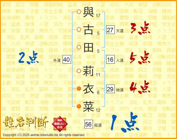 與(17画)古(5画)田(5画) 莉(11画)衣(6画)菜(12画)
