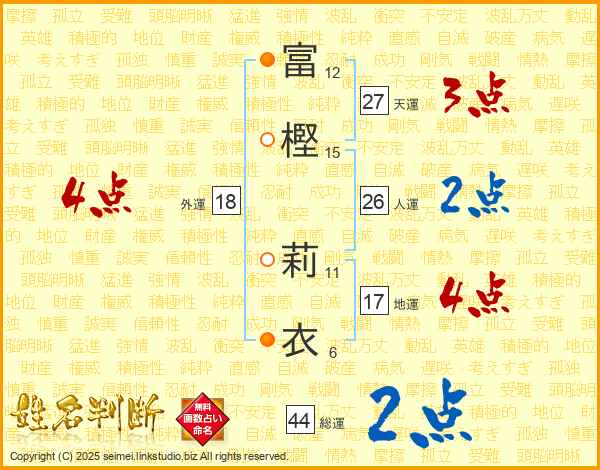 富(12画)樫(15画) 莉(11画)衣(6画)