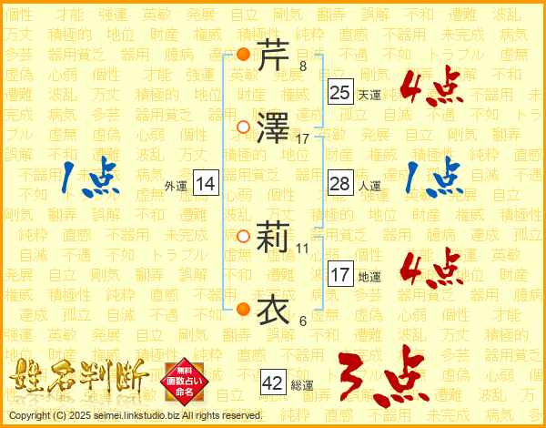 芹(8画)澤(17画) 莉(11画)衣(6画)