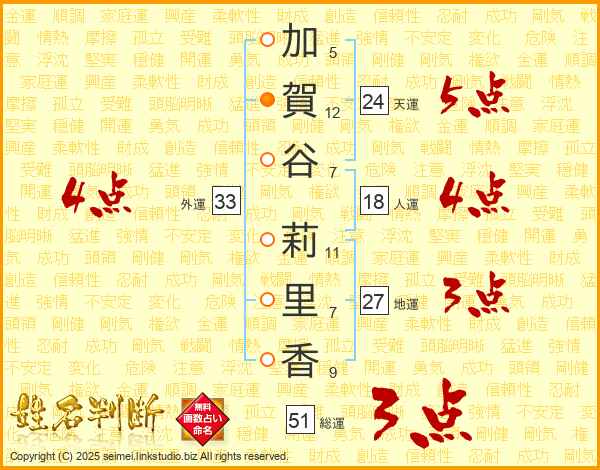 加(5画)賀(12画)谷(7画) 莉(11画)里(7画)香(9画)