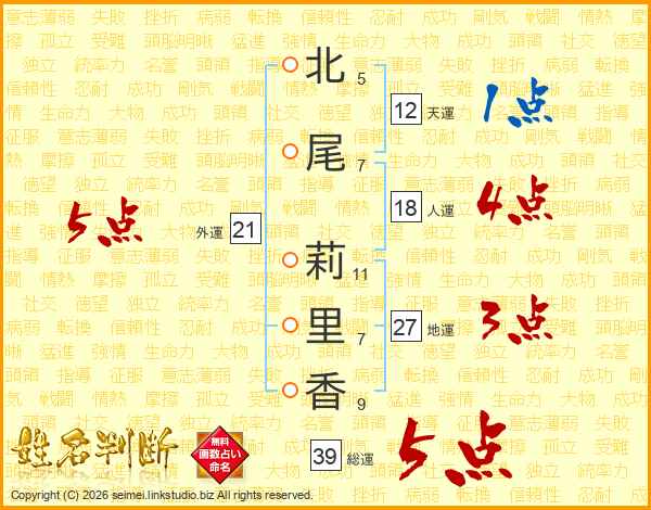 北(5画)尾(7画) 莉(11画)里(7画)香(9画)