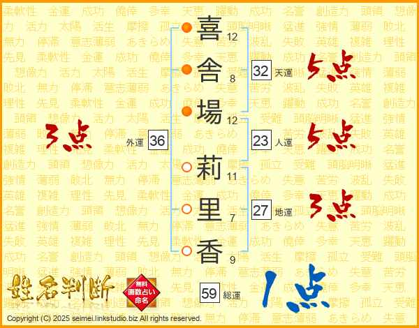 喜(12画)舎(8画)場(12画) 莉(11画)里(7画)香(9画)