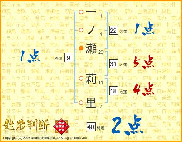 一(1画)ノ(1画)瀬(20画) 莉(11画)里(7画)
