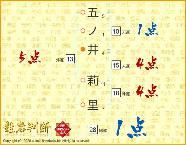 五(5画)ノ(1画)井(4画) 莉(11画)里(7画)