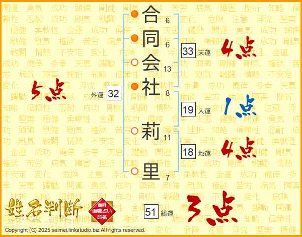 合(6画)同(6画)会(13画)社(8画) 莉(11画)里(7画)