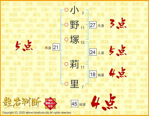 小(3画)野(11画)塚(13画) 莉(11画)里(7画)