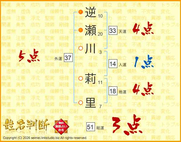 逆(10画)瀬(20画)川(3画) 莉(11画)里(7画)