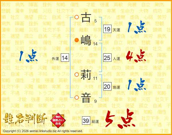 古(5画)嶋(14画) 莉(11画)音(9画)