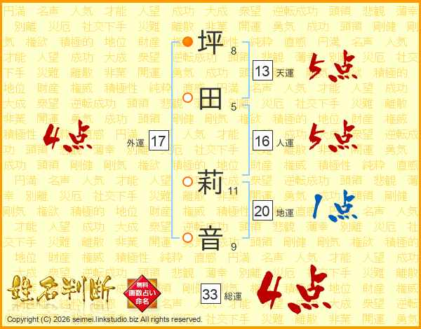 生活面を象徴する運勢です。外部から受ける影響力を表し、結婚運、家庭運や職場、環境への順応性を表します。総運から人運を引いた画数。姓や名が1文字の場合を除く。