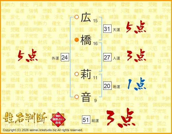生活面を象徴する運勢です。外部から受ける影響力を表し、結婚運、家庭運や職場、環境への順応性を表します。総運から人運を引いた画数。姓や名が1文字の場合を除く。