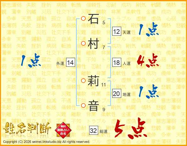 生活面を象徴する運勢です。外部から受ける影響力を表し、結婚運、家庭運や職場、環境への順応性を表します。総運から人運を引いた画数。姓や名が1文字の場合を除く。