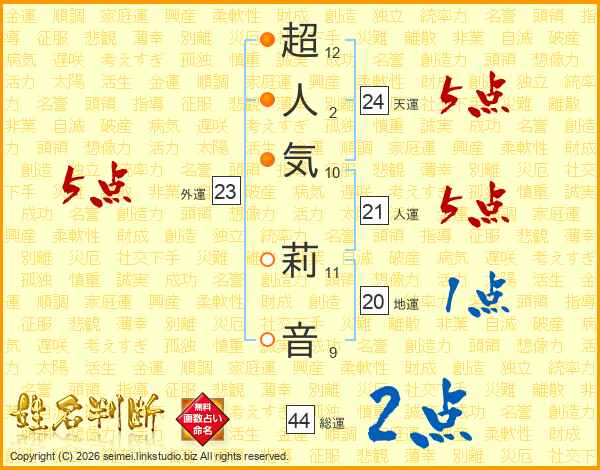 超(12画)人(2画)気(10画) 莉(11画)音(9画)
