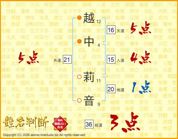 越中莉音さんの総運は36画の3点!