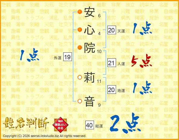 安(6画)心(4画)院(10画) 莉(11画)音(9画)