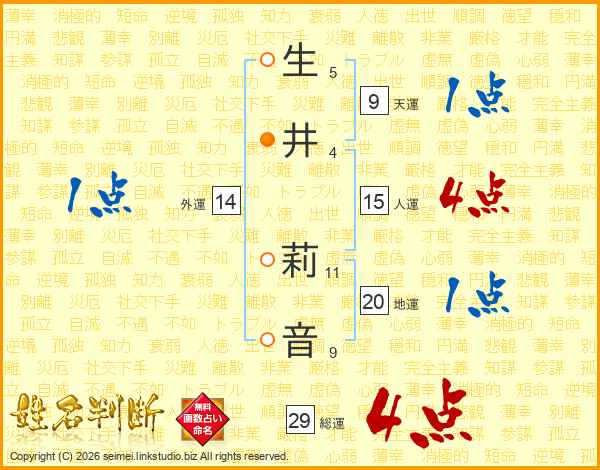 生(5画)井(4画) 莉(11画)音(9画)