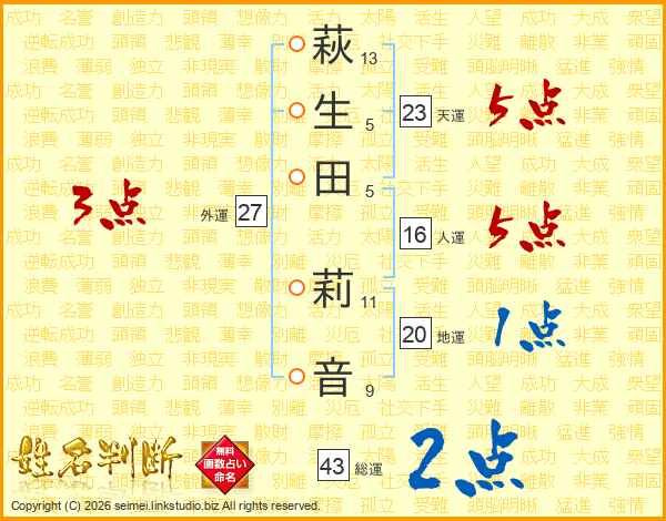 萩(13画)生(5画)田(5画) 莉(11画)音(9画)