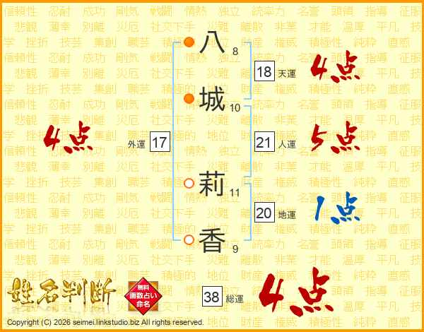 生活面を象徴する運勢です。外部から受ける影響力を表し、結婚運、家庭運や職場、環境への順応性を表します。総運から人運を引いた画数。姓や名が1文字の場合を除く。