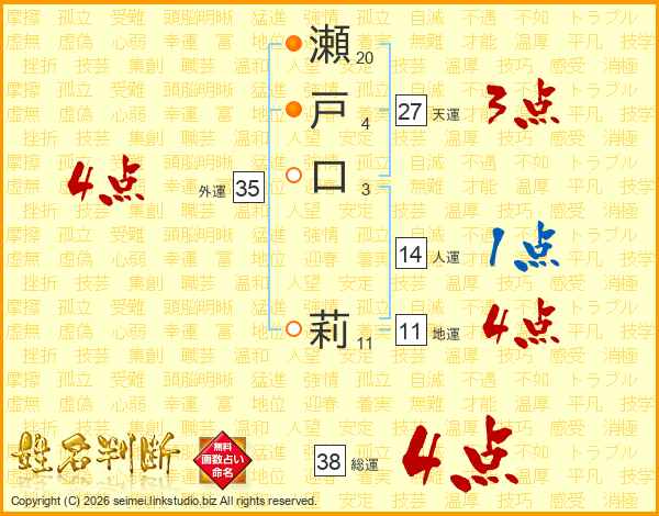 瀬(20画)戸(4画)口(3画) 莉(11画)