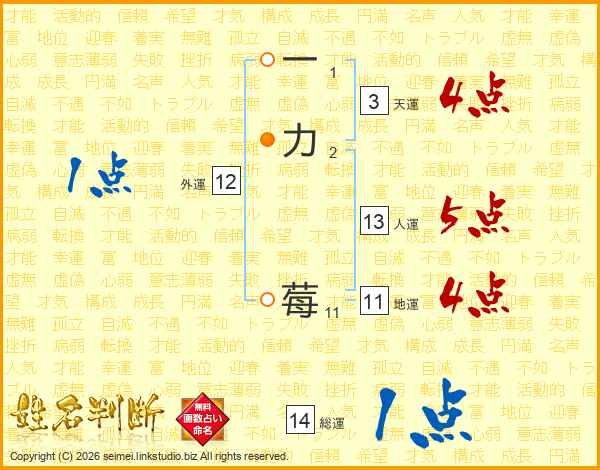 生活面を象徴する運勢です。外部から受ける影響力を表し、結婚運、家庭運や職場、環境への順応性を表します。総運から人運を引いた画数。姓や名が1文字の場合を除く。