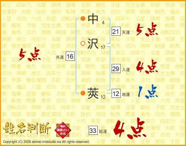 中沢莢さんの総運は33画の4点!