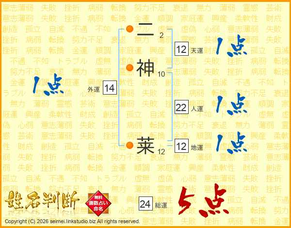 生活面を象徴する運勢です。外部から受ける影響力を表し、結婚運、家庭運や職場、環境への順応性を表します。総運から人運を引いた画数。姓や名が1文字の場合を除く。