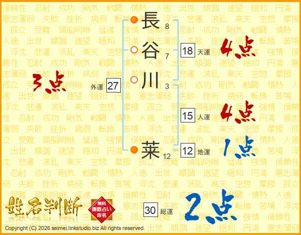 生活面を象徴する運勢です。外部から受ける影響力を表し、結婚運、家庭運や職場、環境への順応性を表します。総運から人運を引いた画数。姓や名が1文字の場合を除く。