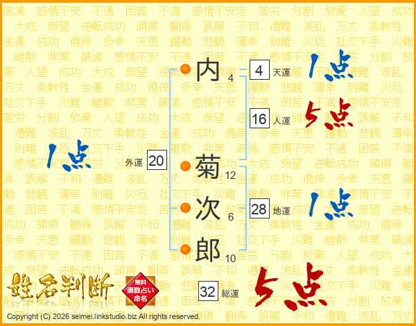 生活面を象徴する運勢です。外部から受ける影響力を表し、結婚運、家庭運や職場、環境への順応性を表します。総運から人運を引いた画数。姓や名が1文字の場合を除く。