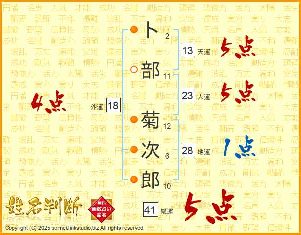 卜(2画)部(11画) 菊(12画)次(6画)郎(10画)